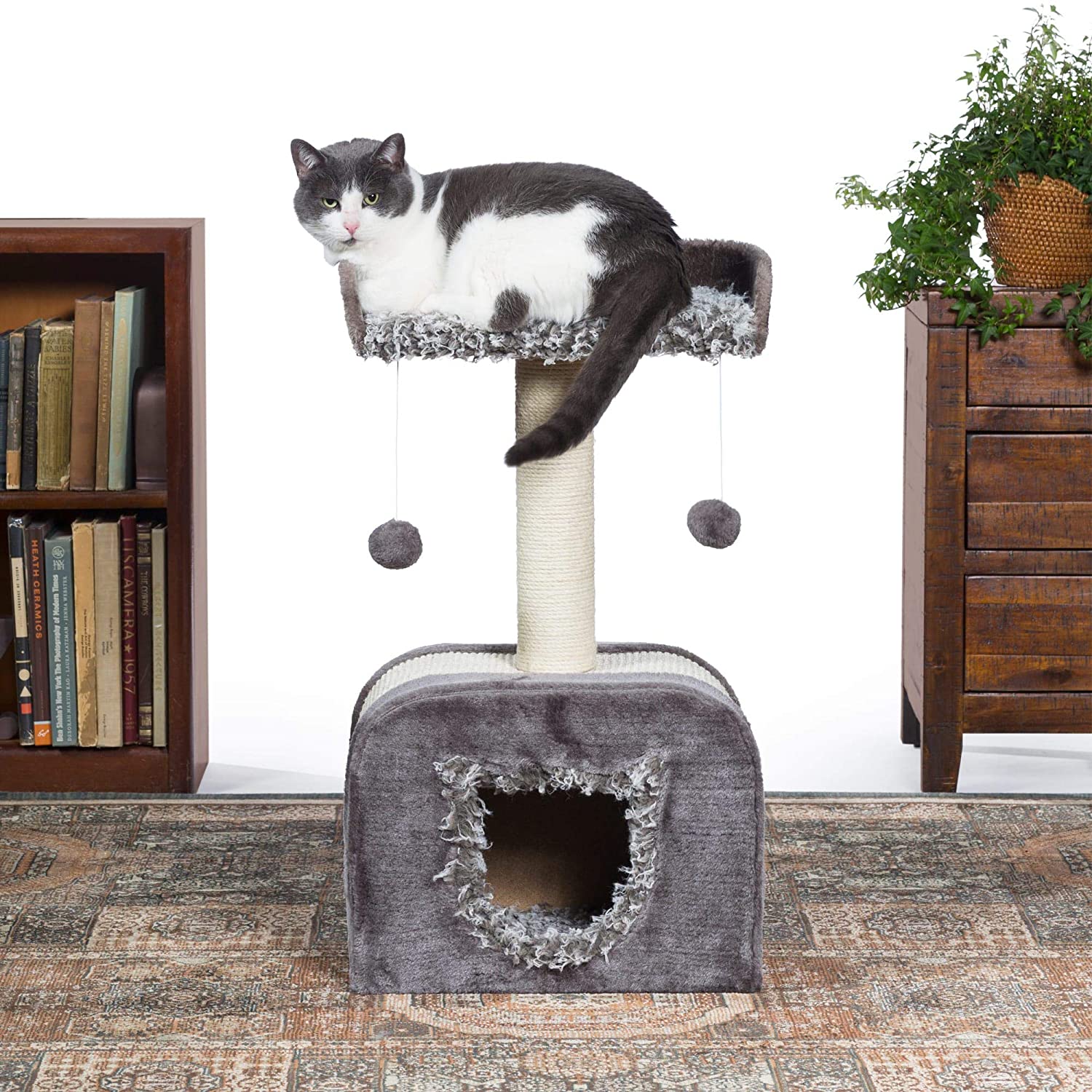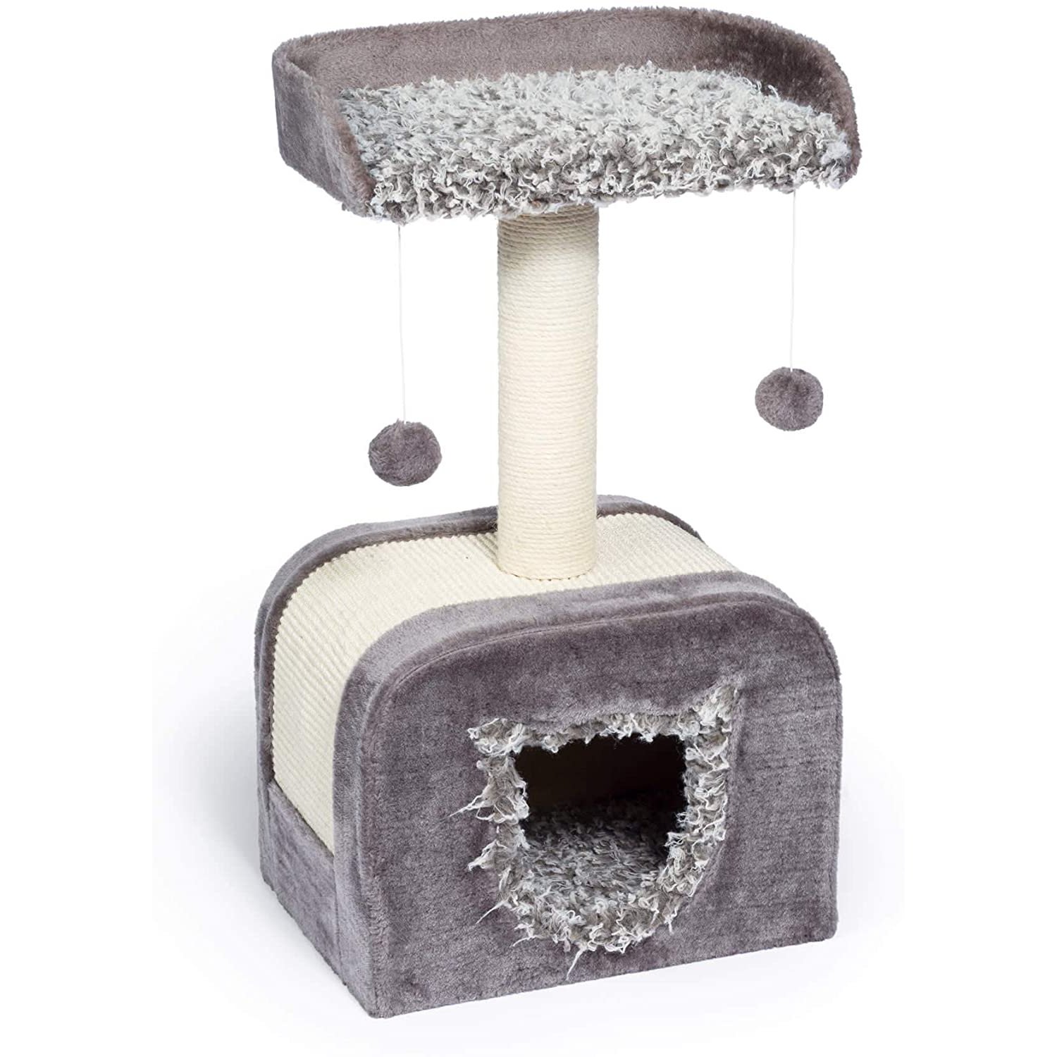 Prevue Pet Products Kitty Power Paws Shag Hideaway 7304 combines plush fabrics with durable jute and natural sisal to provide the perfect place for sleeping, scratching, hiding and playing. In varying shades of Gray the Shag Hideaway cat tree features a soft, shaggy, day bed with a "U" shaped back, making kitty feel more secure. 2 swat toys hang playfully while jute rope scratching posts offer an appealing texture to cats, curbing inappropriate scratching. 16'' Long, 12'' Wide and 29'' High