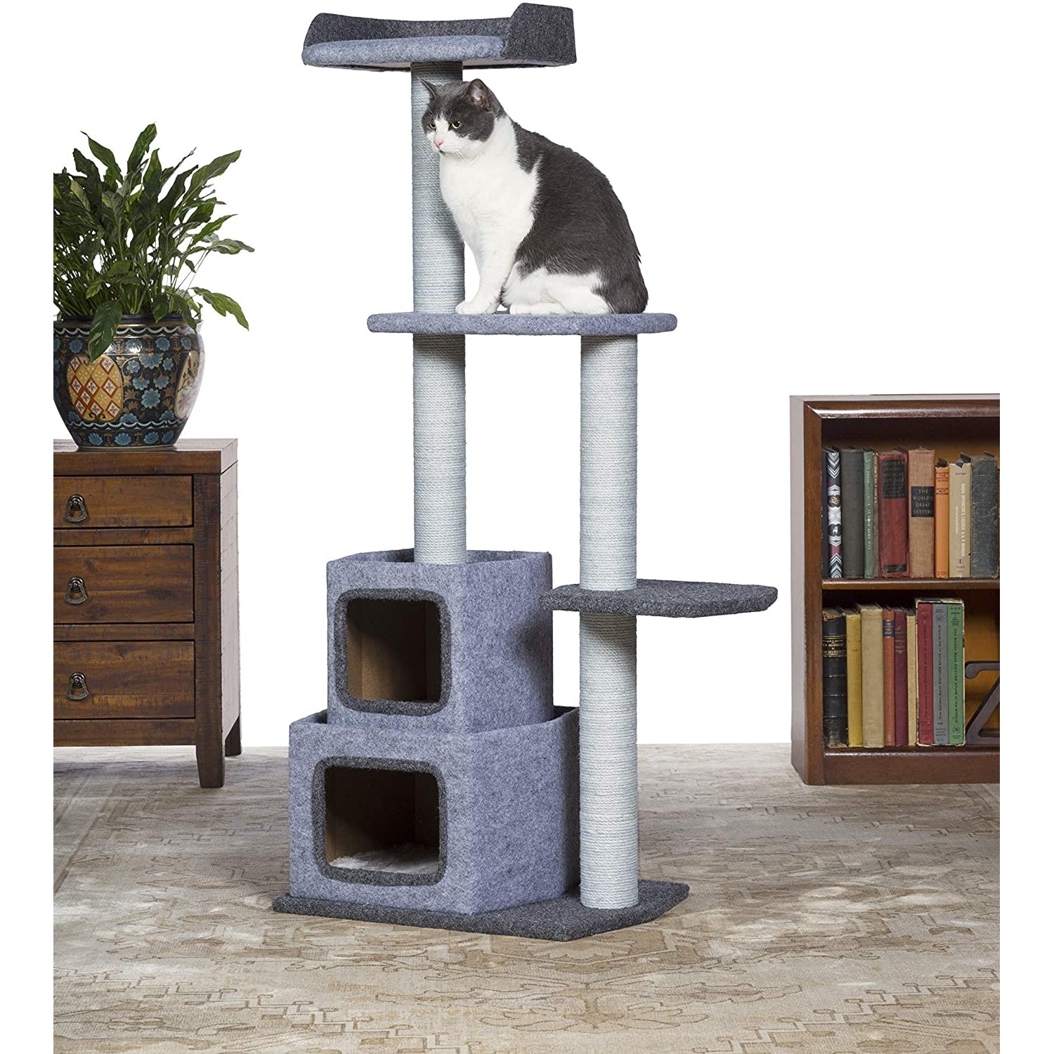 • At 4 1/2 foot tall, this cat tree utilizes vertical space and a compact footprint to save space in your home